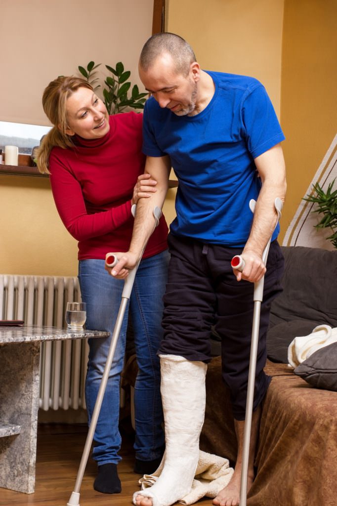 Ein Mann mit Gipsfuß unternimmt erste Gehversuche mit Krücken