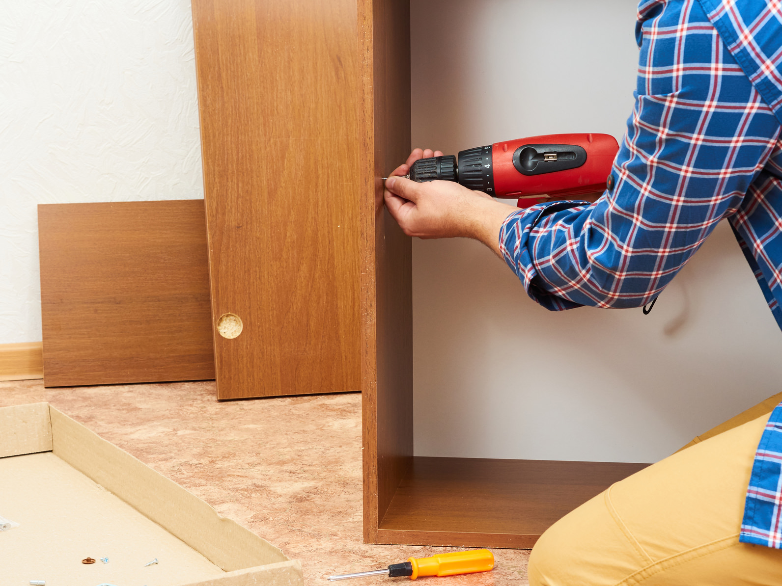 Man in shirt assemble furniture. Domestic work. Craftsman. Carpenter.